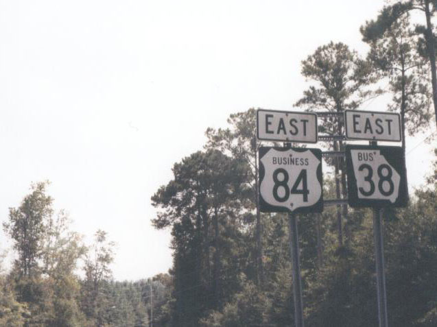 | East US 84/GA 38 Business shields; Thomasville. Interesting that the word 'Business' fits inside the US highway shield but only 'Bus.' can fit in the GA shield. | JP Nasiatka; September 14, 2003 |