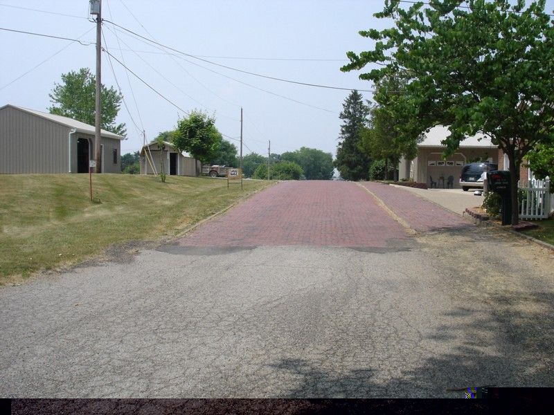 Leaving Norwich from the west, the old National Pike follows Brick Road. Here for about a mile, the old highway holds onto its early 20th century heritage as a brick road. (Photos below taken by Mike Kentner; June 2, 2007.) |