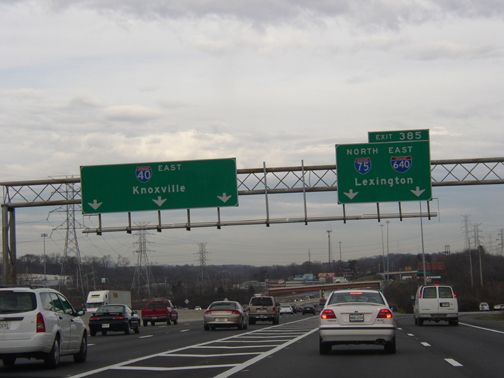 | Overheads for I-40 East; I-75 North/I-640 East (Exit 385); Knoxville. This is where I-75 North splits from I-40 East, and this marks the Western Terminus of I-640. | Chris Patriarca; December 30, 2002 |